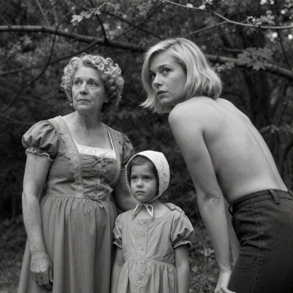 Black and white photograph of three people in a forest setting. Features a topless young woman with short blonde hair leaning forward, an older woman with curly hair wearing a vintage ornate dress, and a young child in a bonnet and dress standing closely. The background includes tree branches and dense foliage, portraying intense and contemplative expressions.
