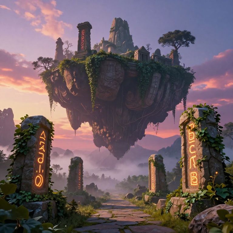 Bereth, a fantasy landscape with a mysterious floating island, ancient ruins covered in ivy, glowing runes etched into stones, soft mist and twilight sky, vivid colors, intricate details, atmospheric lighting with a magical aura.