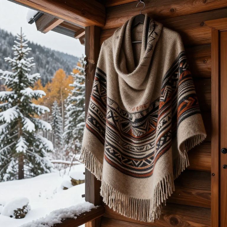 A thick woolen shawl with intricate tribal patterns hanging on a mountain cabin wall, snow-covered pine trees outside, autumnal forest backdrop, cozy indoor scene, deep earthy colors, hyperrealistic details, Dall-E style.
