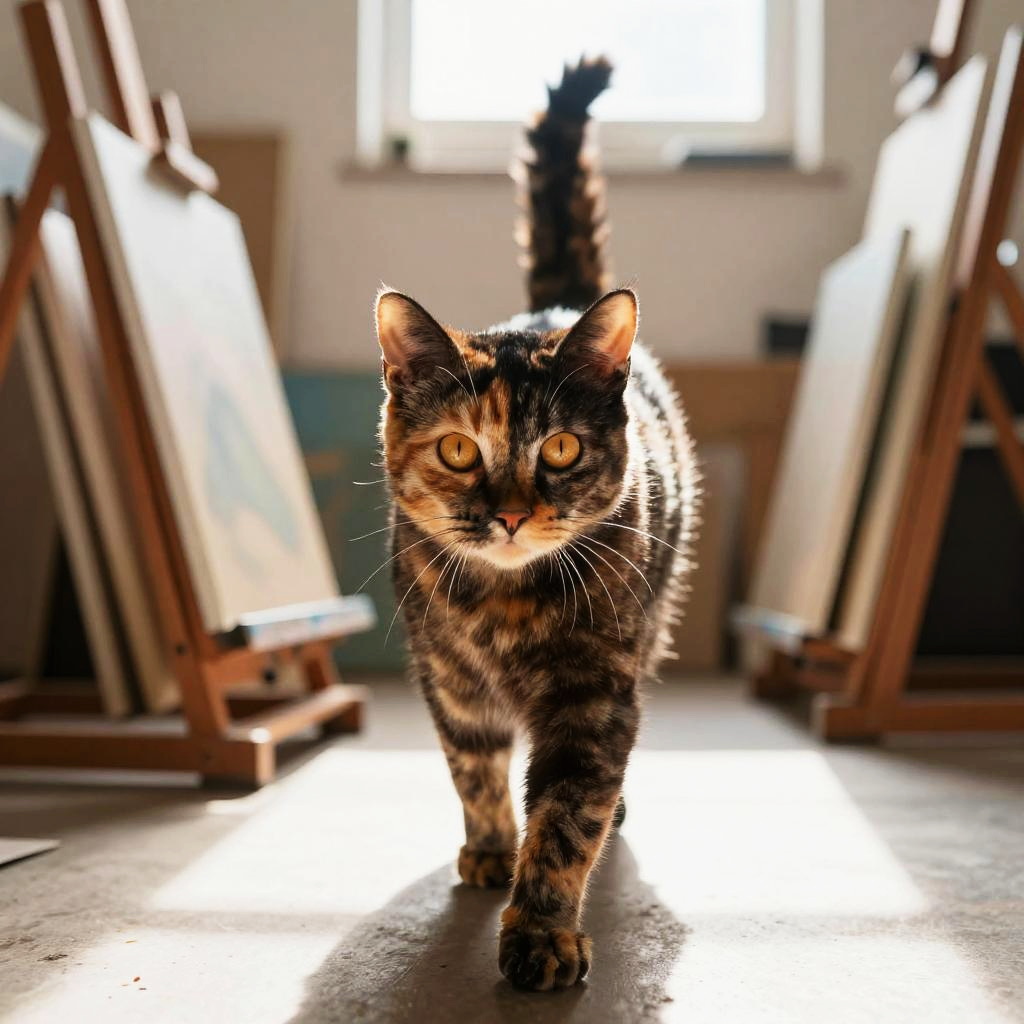 Curious tortoiseshell cat with bright amber eyes confidently walking toward the viewer across sunny artist’s studio cluttered with canvases and wooden easels, lit by bright midday sunlight from skylight window. Natural textures of fur, fabric, and wood emphasized; inviting and homey atmosphere; shallow depth of field; crisp whiskers; soft vignetting; balanced composition; subtle film grain; realistic color rendering; gentle contrast; fine detail throughout.