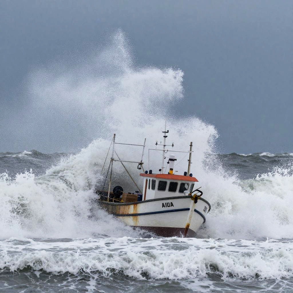 Raging ocean with towering waves engulfing a small fishing boat, stormy gray sky, violent sea spray, dramatic tension, realistic textures and dynamic composition