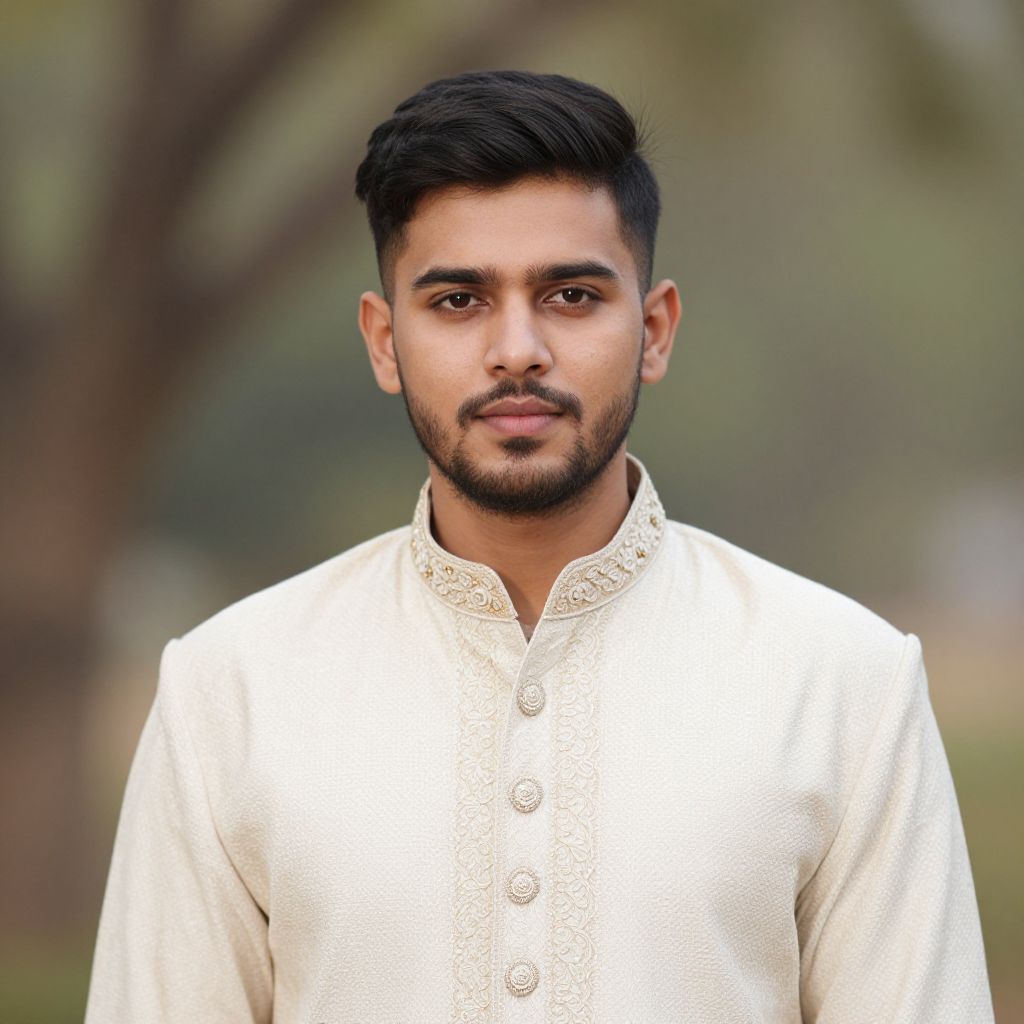 Jodhpuri suit wedding groom, 1boy, male focus, solo, facial hair, black hair, beard, looking at viewer, blurry background, blurry, mustache, upper body, realistic, short hair, asian