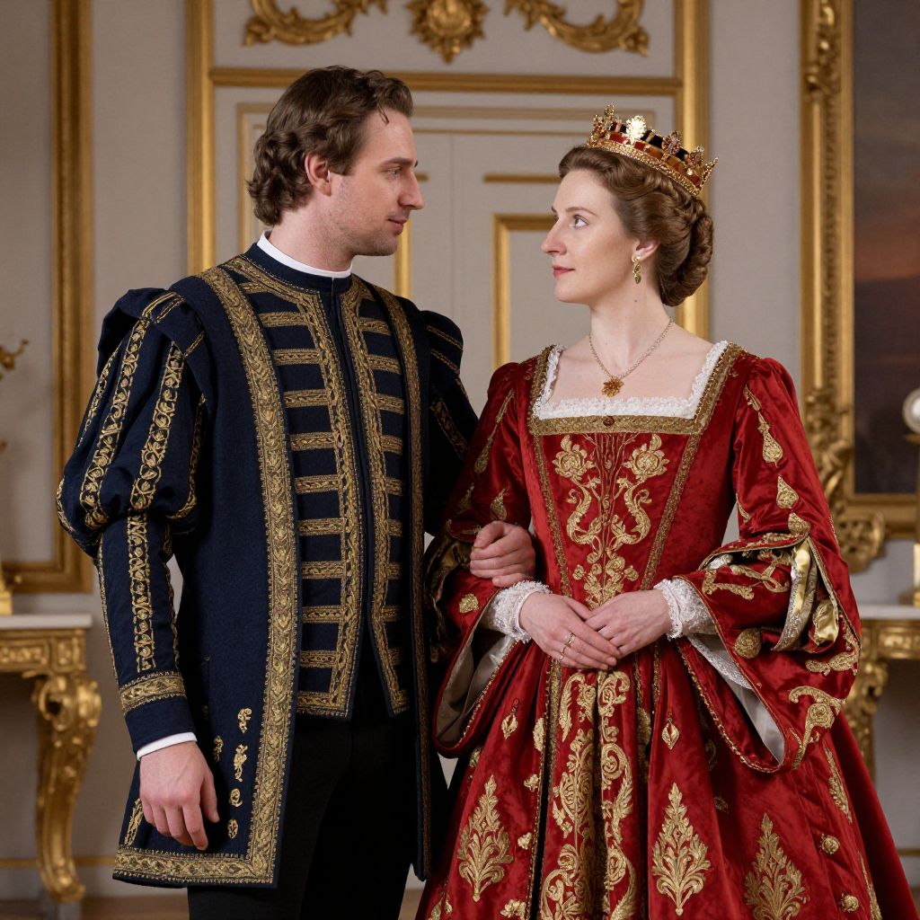 Elegantly dressed royal couple in ornate Renaissance attire stand side by side, the man in a navy doublet with gold embroidery and the woman in a rich red gown adorned with gold patterns and a crown, both gazing tenderly at each other within a grand, opulent interior.