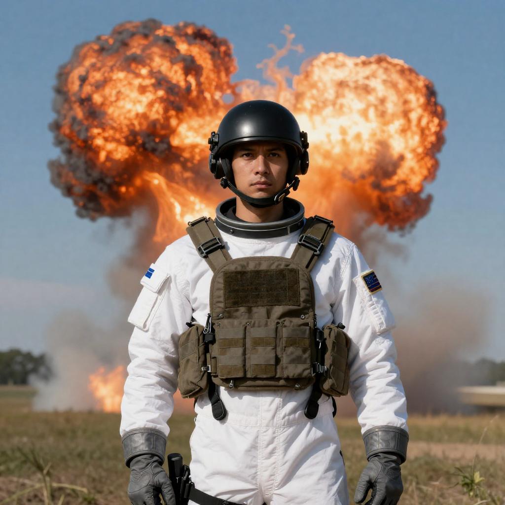 Soldier in White Spacesuit Amid Explosion