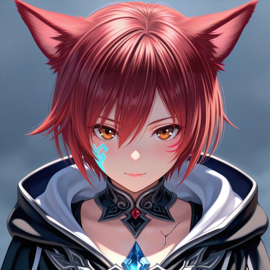 Crystal exarch, final fantasy, 1boy, cat boy, cat ears, red eyes, hair between eyes, slit pupils, red hair, short hair, hooded robe, black robe, hooded robe, black robe, hood down, miqo'te, material growth, facial mark, crystal, by artist nekopuchi, illustrious