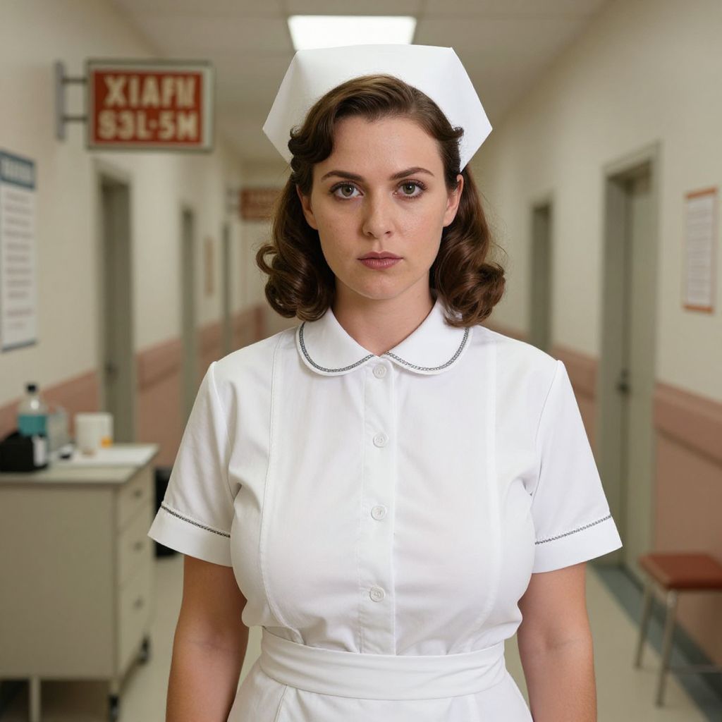Photograph of a white female nurse with brown hair in a 1940s-style uniform, white cap, standing in a clinical hallway with "X
