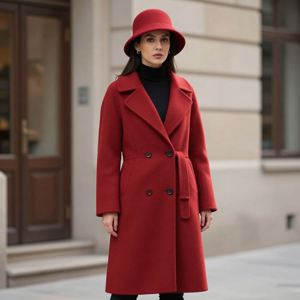 Photograph of a young woman standing outdoors in front of a beige building with large windows and wooden doors. She has fair skin, long dark brown hair, and is wearing a bright red, knee-length, double-breasted coat with black buttons and a tie-belt. She also wears a matching red, wide-brimmed hat and a black turtleneck. Her expression is neutral, and she stands with her arms relaxed at her sides. The background is slightly blurred, emphasizing her stylish, autumnal outfit. The overall style is modern and chic, with a focus on bold, coordinated colors.