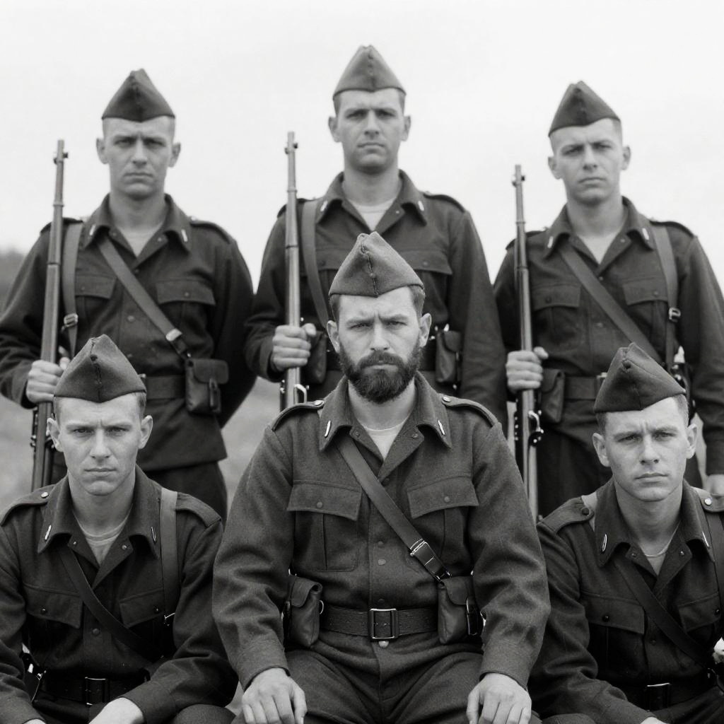 Black-and-white photograph of six male soldiers in Civil War-era uniforms, standing and sitting with rifles, intense expressions. Five wear caps, one in hat. Three standing, three sitting. Background blurred. Soldier in front center has beard, others clean-shaven. Uniforms dark, rifles upright.