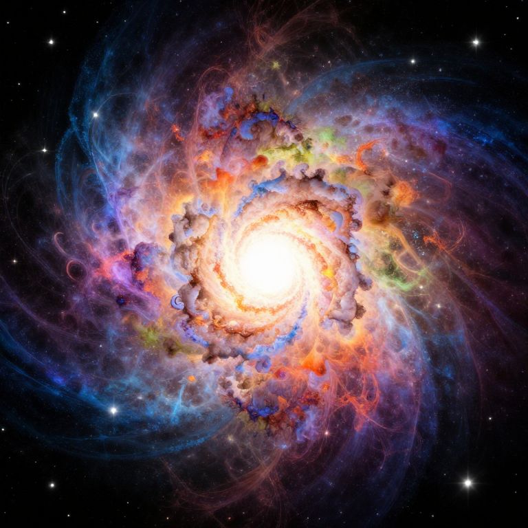 Photograph-like CGI image of a vibrant, swirling galaxy. The center is a brilliant white, luminous core surrounded by a swirling vortex of colors including bright orange, red, blue, and purple. Gas clouds and stellar formations create a textured, dynamic pattern. The outer edges fade into a dark, star-studded space. The image captures the galaxy's energetic and chaotic beauty, with intricate details and vivid colors, showcasing the awe-inspiring complexity of cosmic structures.