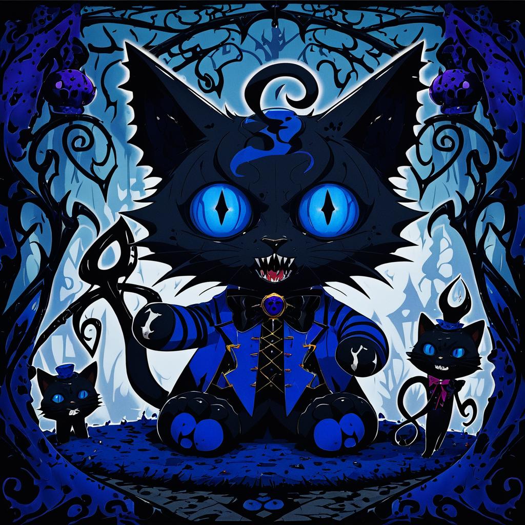 Grim (twisted wonderland), twisted wonderland, no humans, 1boy, demon tail, cat ears, blue eyes, hair between eyes, black hair, virtual youtuber, cat, blue sclera, creature, by artist shun (rokudena-shi), dark_illustrious