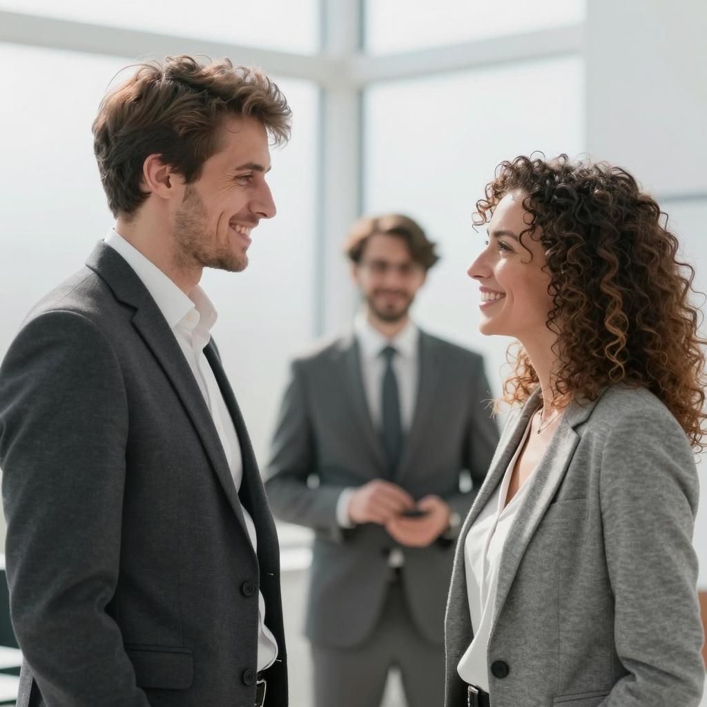 Three people in a modern living room. Man in black suit and white shirt sits on blue chair, facing two people on black sofa. Sofa man wears red shirt, woman in black top with curly hair. Glass coffee table with books and glasses. Silver arched floor lamp. White carpet, sheer white curtains in background. Sofa has gray and blue pillows.