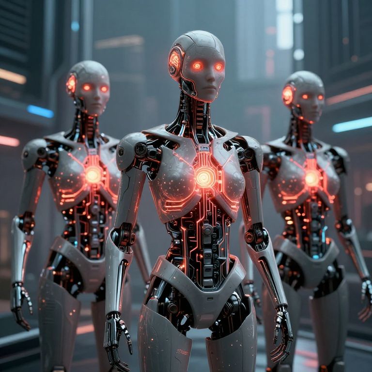 Photorealistic CGI image depicting three humanoid robots with sleek, metallic bodies standing in a futuristic urban setting. The robots have white, glossy exteriors with intricate black wiring visible beneath. Each robot has glowing red eyes and an illuminated red chest light resembling a heartbeat. The background features tall, illuminated skyscrapers with blue and red neon lights. The robots stand in a row, with the central one slightly in front and to the right, while the other two are slightly blurred in the background. The scene has a cyberpunk aesthetic with a cool, blue-tinted atmosphere.