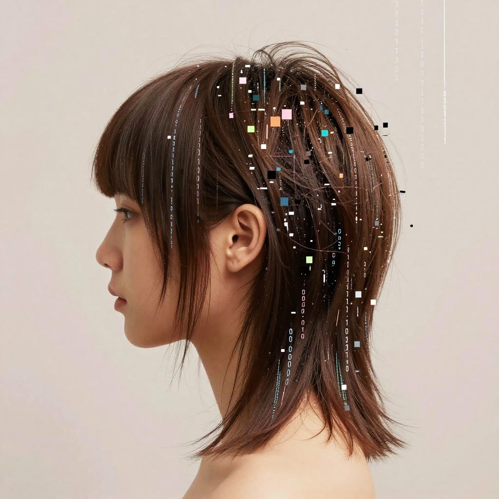 AI generated haircut, surreal blend of organic hair and digital pixels disintegrating gently into binary code, soft pastel background with floating data streams, hyperrealistic depiction of innovation in hairstyling, artistic and futuristic mood