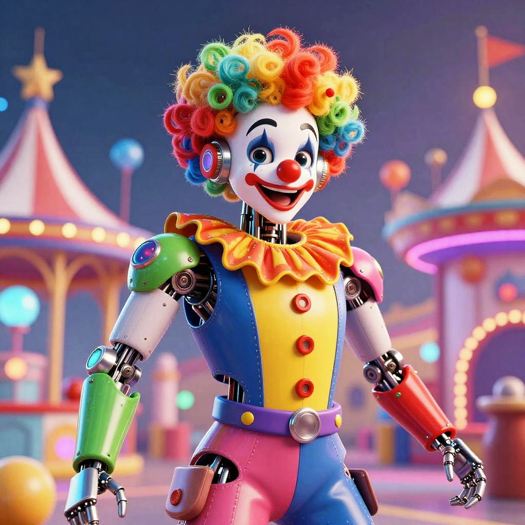 A vibrant digital artwork of a futuristic clown character, blending traditional circus attire with advanced robotic elements, bright neon colors, and a playful expression, set against an abstract, high-tech carnival background.