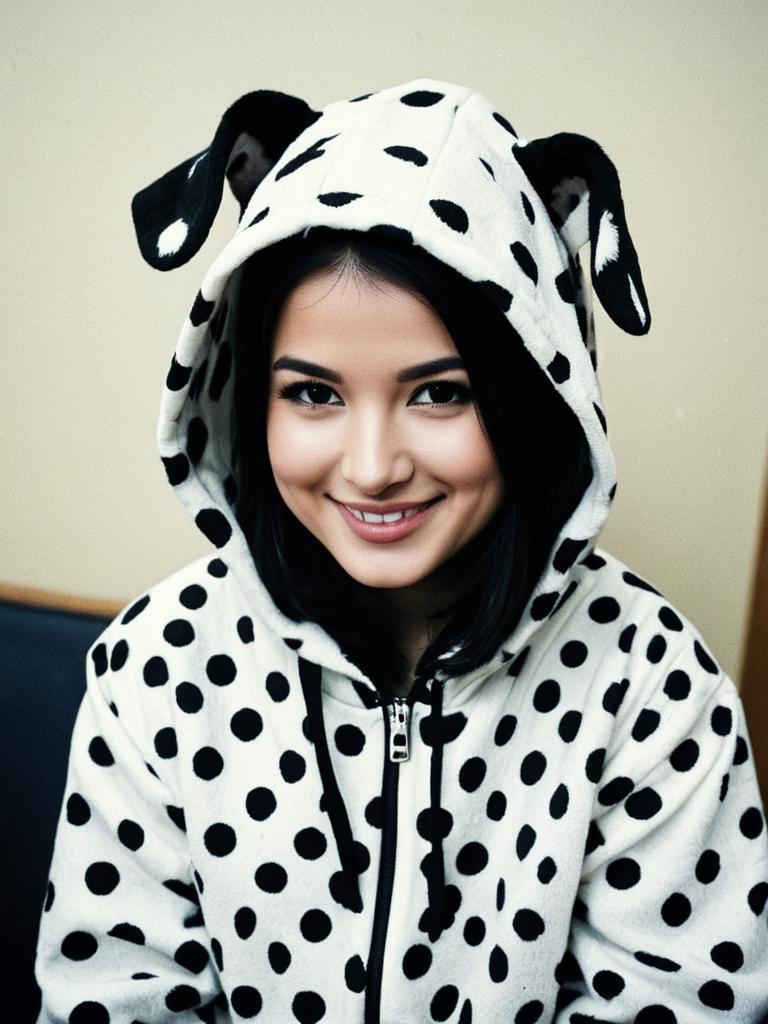 Youth dalmatian costume, solo, realistic, 1girl, animal costume, looking at viewer, hood, smile, polka dot