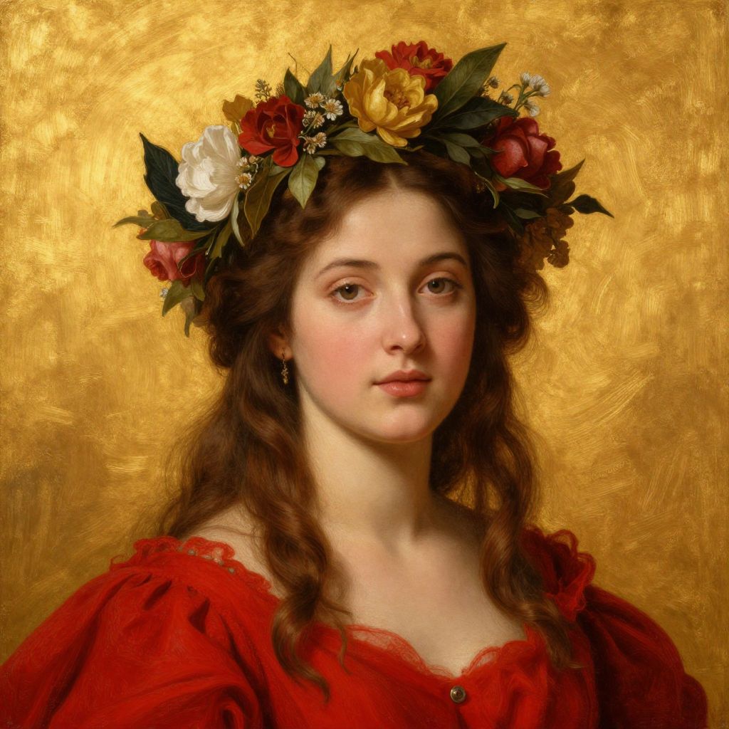 Classical portrait of a young woman with fair skin, brown wavy hair, wearing a red dress and floral crown, against a gold textured background.