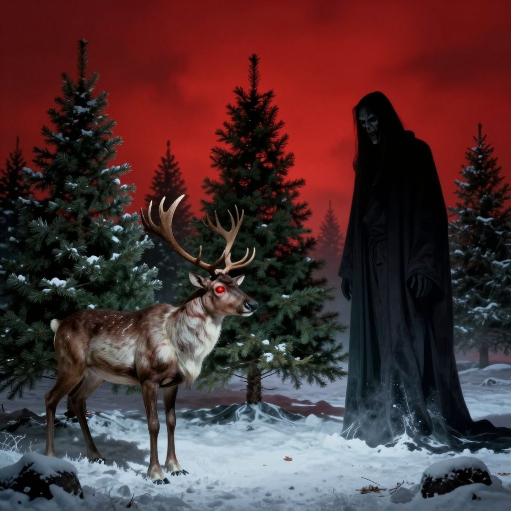 Photorealistic digital artwork depicts a snowy forest with a vivid red sky. A reindeer with large antlers, glowing red eyes, and a fur-covered body stands in the snow on the left. To the right, a tall, shadowy figure dressed in a black, hooded cloak stands partially obscured by the trees. Snow-covered pine trees fill the background, creating a contrast with the dark, ominous figure and the bright red sky. The reindeer's alert posture contrasts with the figure's mysterious, looming presence. The scene evokes a sense of eerie tension and supernatural elements.
