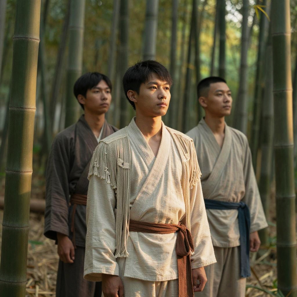 Fringe Asian men in traditional attire, standing in lush bamboo forests during golden hour, soft natural light, intricate textures, serene and contemplative mood.