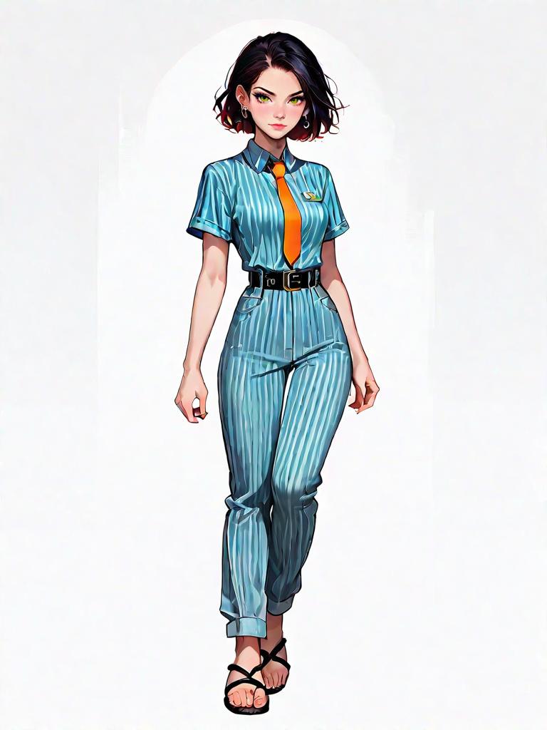 1girl, source_comics, realistic face, full body shot, Woman, casual chic, striped button-up jumpsuit in burnt orange and white, short sleeves, V-neckline, cinched waist with tie belt, cropped straight-leg pants, black strappy flat sandals, minimal jewelry with stud earrings, walking pose, plain white background.