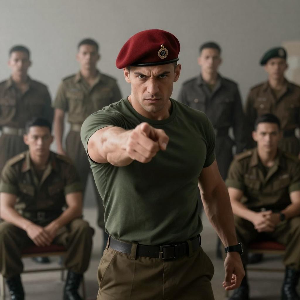 Muscular man with short hair and beard, wearing a sleeveless green vest over a black tank top, holds a rifle in his right hand. Multiple soldiers in green uniforms and black clothing walk in the background. Smoky, outdoor setting with buildings and vehicles. Man's chest has a tattoo. Background soldiers have intense expressions.