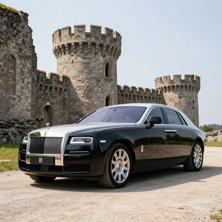 Normal Map Rolls Royce Ghost professional fotoshooting, Vehicle placed in front of a castle ruin, f/ 2,