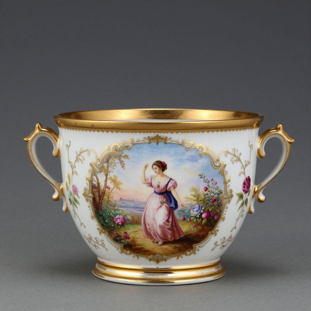 Exquisitely crafted Neoclassical-inspired hand-painted French porcelain wine cooler featuring a gold-trimmed rim, base, and handles, adorned with a central pastoral scene depicting a woman in a pink dress amidst floral motifs and delicate gold embellishments.