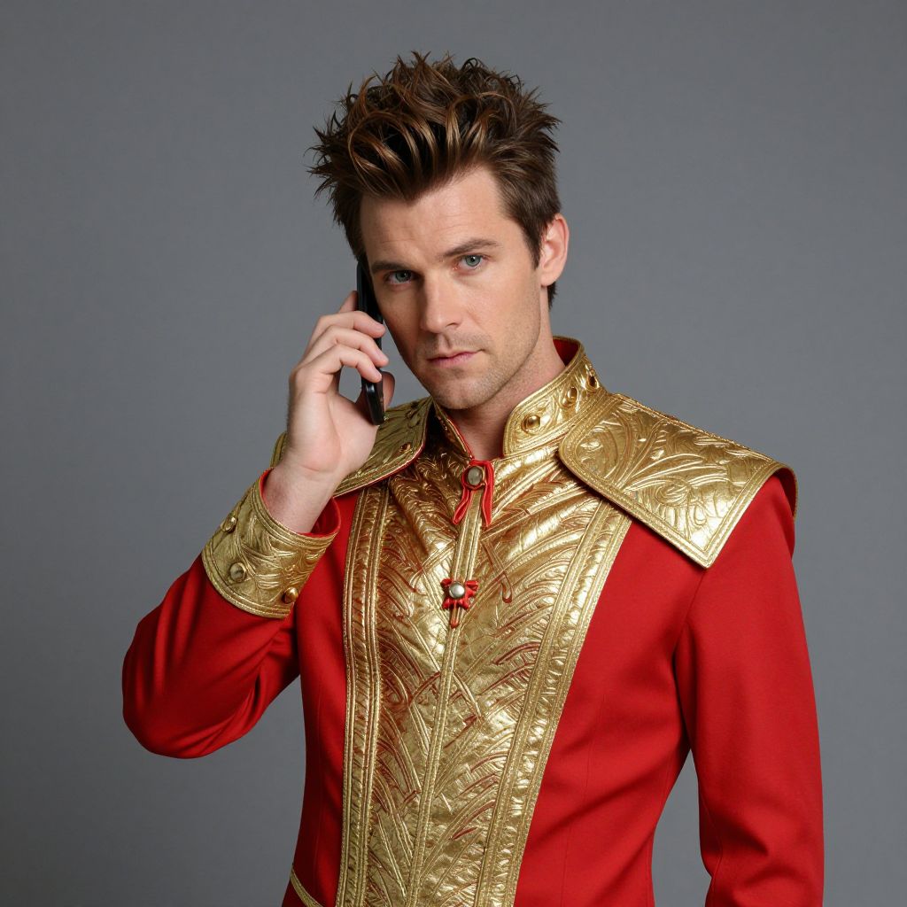Urkel Costume, man in a red and gold outfit with a cell phone