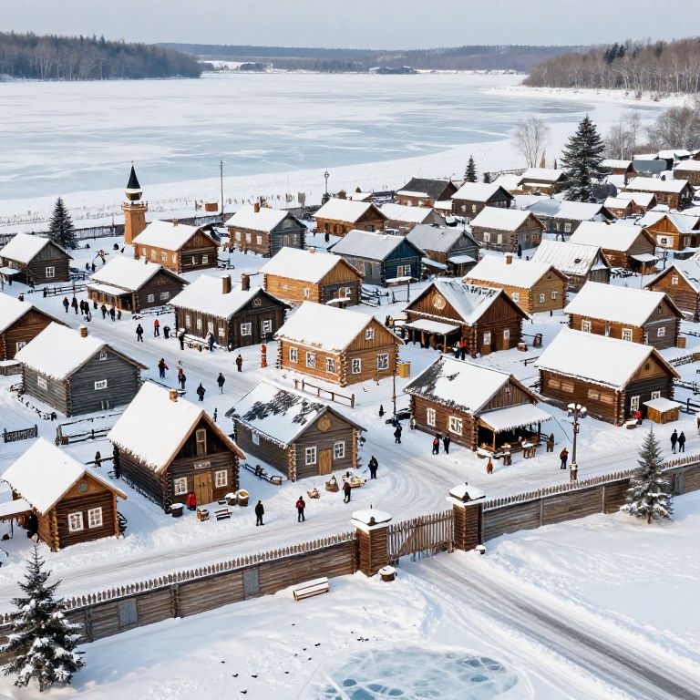 A birds-eye view of a busy wooden town with diverse buildings covered in snow, situated at the edge of a frozen lake. The town is enclosed by a wooden wall with a gate, featuring snowy streets and scattered people dressed in winter clothing. The surrounding landscape includes snow-covered trees and a vast ice-covered lake extending into the horizon.
