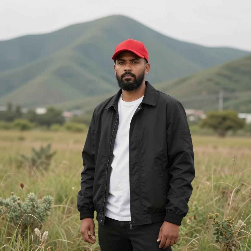 Man with brown skin, beard, red cap, white shirt, black jacket, standing in front of a green mountainous landscape. Mountain with rocky peak in background, clear blue sky with scattered clouds. Man's expression is serious. Grass and small bushes in foreground.