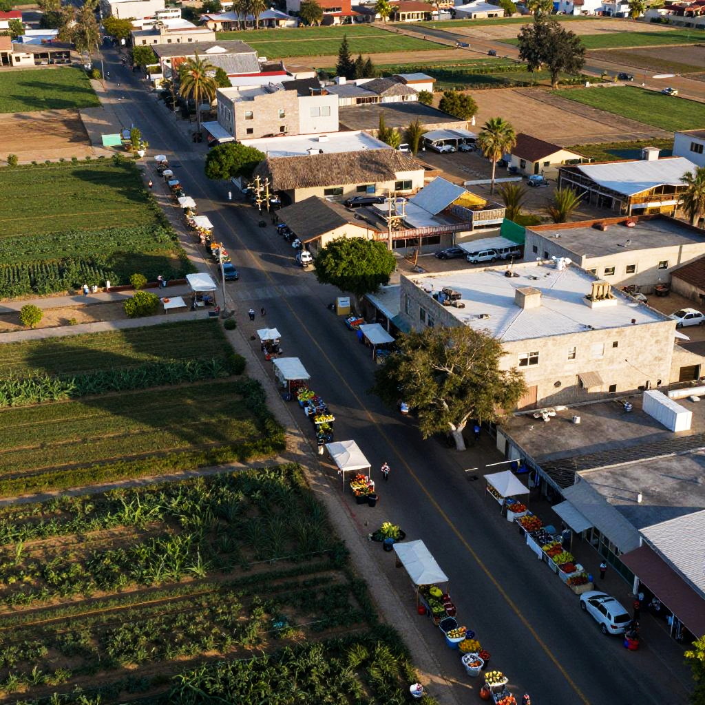 Aerial view of Salinas city streets bordered by lush agricultural fields, with lively farmers markets and colorful produce stalls, warm afternoon sun casting long shadows, modern yet rustic vibe, high resolution urban and rural blend