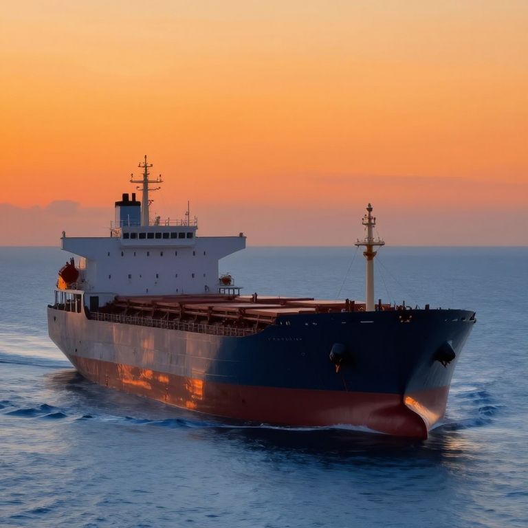 A massive unladen cargo ship sailing smoothly on calm blue ocean waters at sunset, glowing orange sky with gentle waves, reflections on the hull, intricate ship details, vast open sea background, photorealistic digital painting of maritime transport