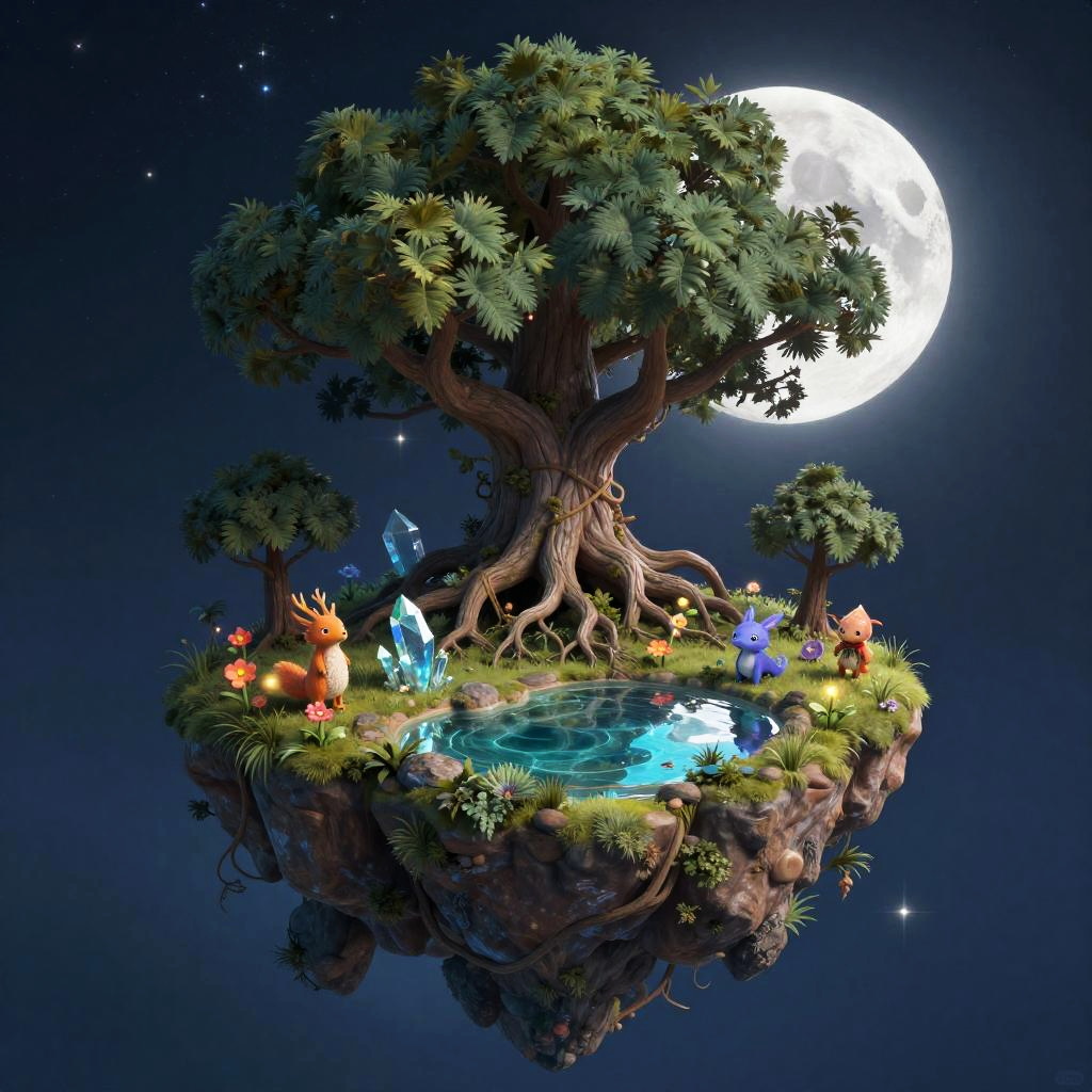 Detailed floating island fantasy art showing a towering tree with sprawling roots wrapping around a floating rock, inhabited by whimsical creatures, glowing flowers, and a crystal-clear pond reflecting a starry night sky with a majestic moon in the background.