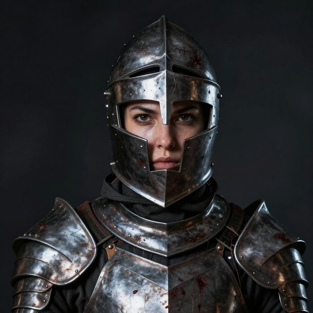 Female knight art, close-up portrait of a strong female knight with battle scars, detailed metal helmet, intense expression, realistic textures, dark moody background