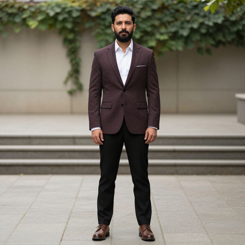 Photograph of a bearded man standing outdoors on a tiled pavement. He has dark hair, a medium build, and a serious expression. He wears a dark brown, slim-fit blazer with a white dress shirt, black trousers, and brown leather shoes. The background features a light gray wall with green ivy climbing up, and three steps leading upward. The image has a sharp, professional quality with balanced lighting and a slightly shallow depth of field, keeping the man in sharp focus while softly blurring the background.
