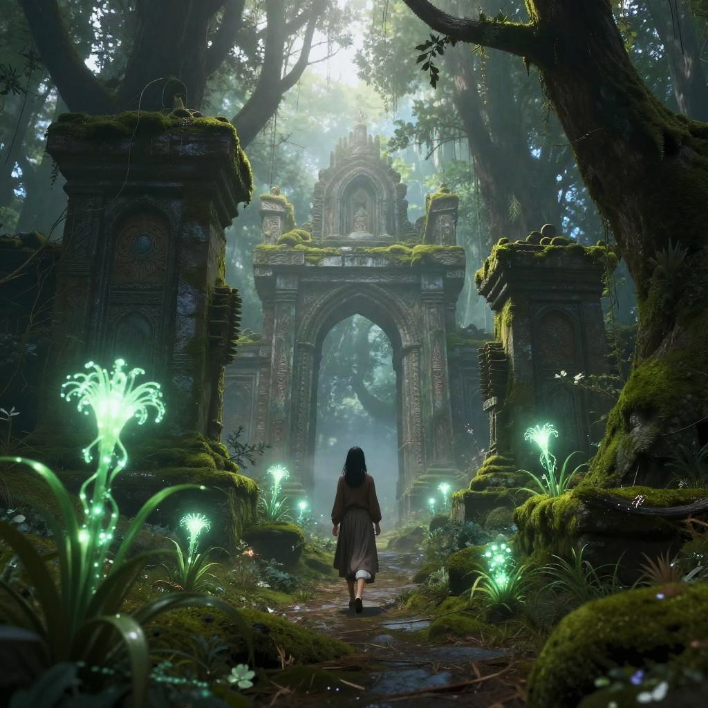 A surreal scene featuring the word 'Zahl' as a massive stone sculpture in an ancient ruin, overgrown with moss and ivy, dramatic lighting with sunrays piercing through fog, mystical and serene mood