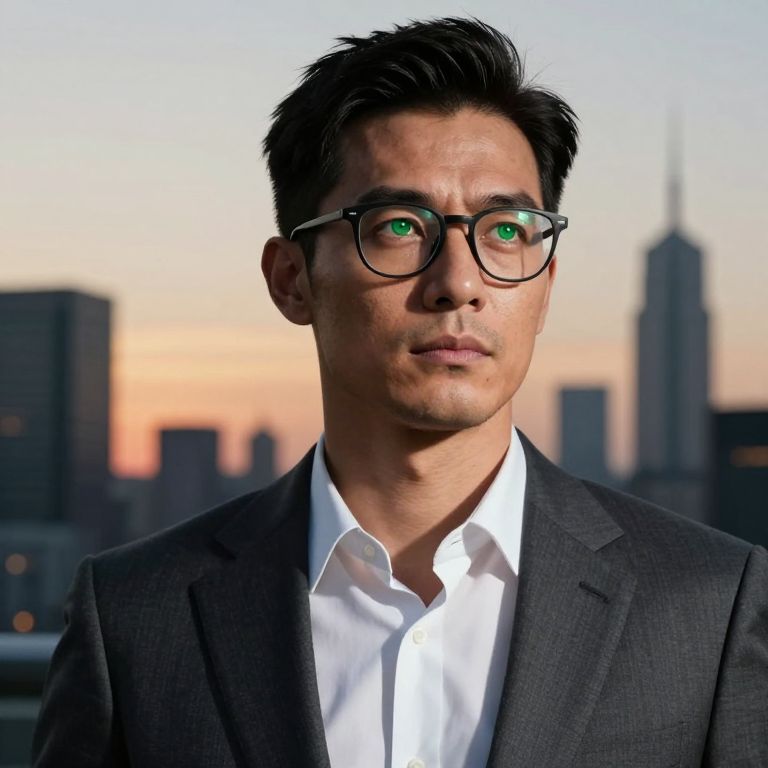 Photograph of an Asian man with short, black hair and green eyes, wearing black-rimmed glasses, a dark gray suit jacket, and a white dress shirt. He stands against a city skyline backdrop with tall buildings and a sunset sky in soft orange and blue hues. His expression is serious and focused, and the lighting highlights his facial features. The image has a slightly digital, polished look with a soft focus on the background, drawing attention to the man's face.