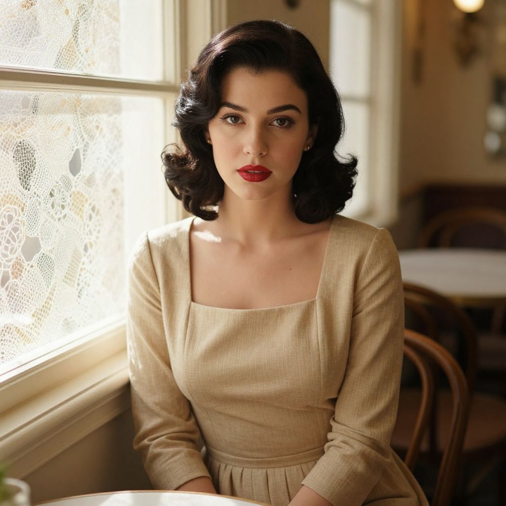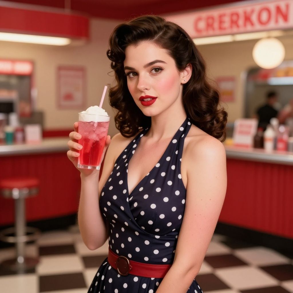 1girl, (realistic:1.2) 1950s rockabilly style, ( polka dot halter dress), detailed skin texture, Extremely detailed nineteen fifties soda fountain shot with checker board floors, (professional studio backgroun:1.2), (blush:1.2), (goose bumps:1.2)