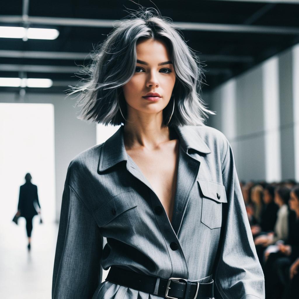 A young woman with straight silver hair and multiple floral tattoos on her arms wearing a sleeveless red dress stands inside a modern, all-white hair salon reception. The scene features natural lighting and a minimalist interior with large mirrors and salon chairs. The focus is on the woman in profile with a reflection visible, highlighting her distinctive style and the clean design of the salon.