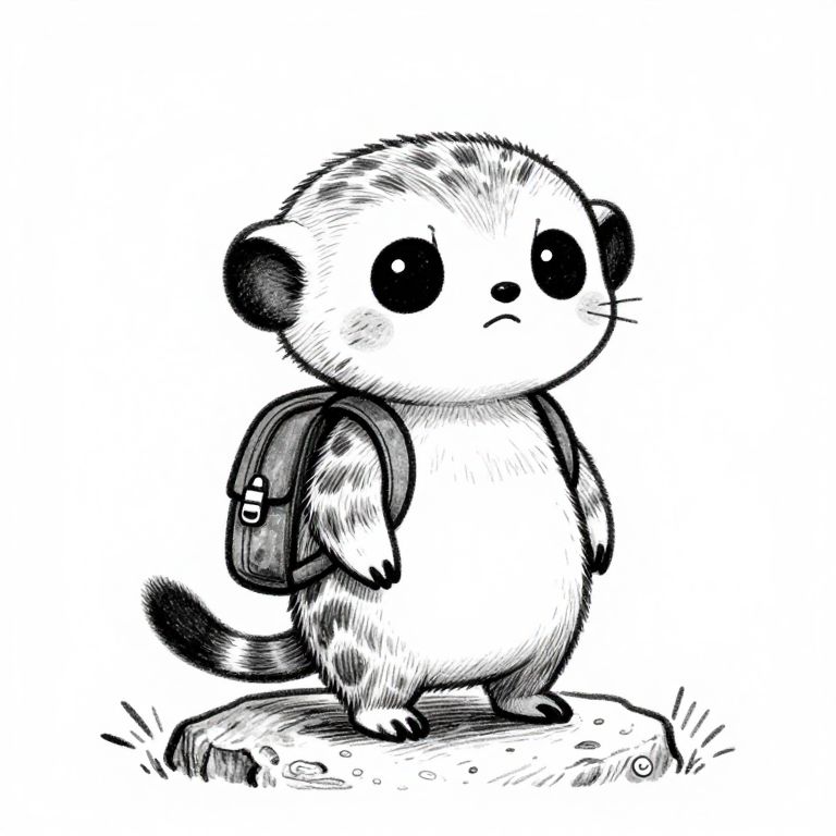 "Cinderella ink drawing cute robot meerkat with big sad eyes, wearing a backpack, standing on a rock low detail, no shading, no grey, white background,"