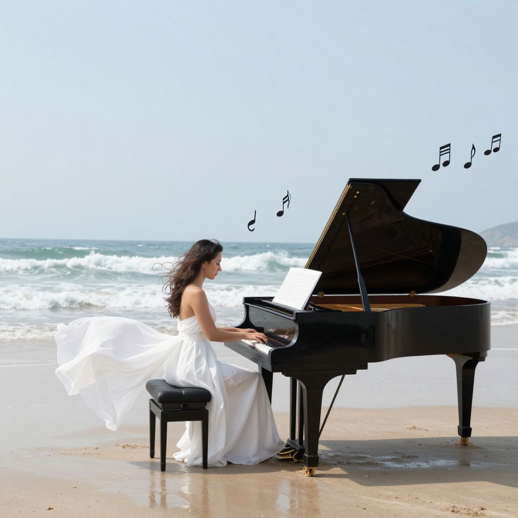 A woman in a flowing white dress gracefully plays a grand piano perched on a wet sandy beach, as musical notes float around her, blending with the serene ocean waves beneath a clear sky.