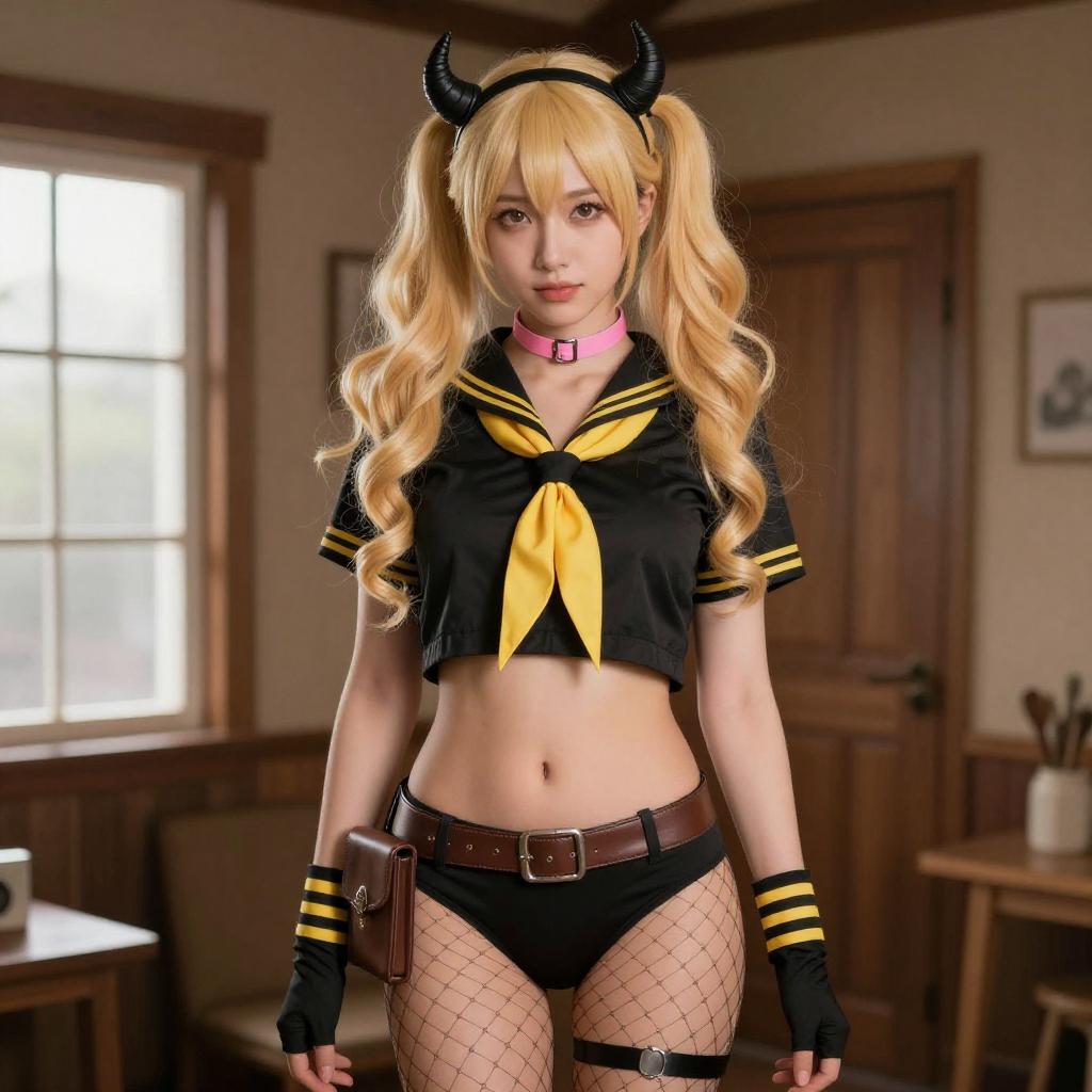 Photograph of a blonde woman in a cosplay outfit, wearing a black sailor-style top with yellow accents, black shorts, fishnet stockings, and a black cap with a gold emblem. She has long, wavy hair, red lipstick, and a pink choker. She stands in a dimly lit room with wooden doors, holding a yellow sleeve of her jacket.