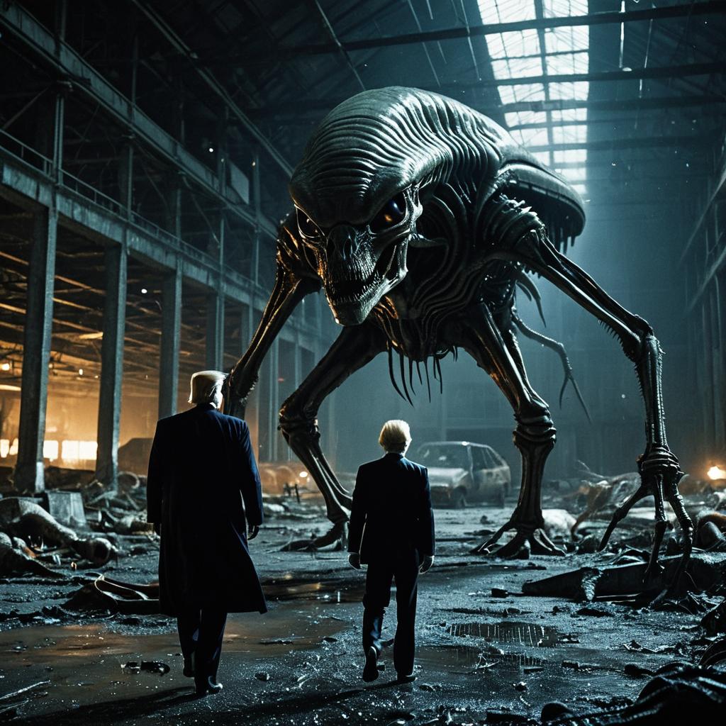 A cinematic still showing two figures resembling Donald Trump walking toward a large, sickly alien creature in a dark, abandoned warehouse filled with debris and dead alien animal remains. The scene is illuminated with sharp, dramatic lighting, evoking a dystopian or sci-fi movie atmosphere with a rainy, night-time setting.