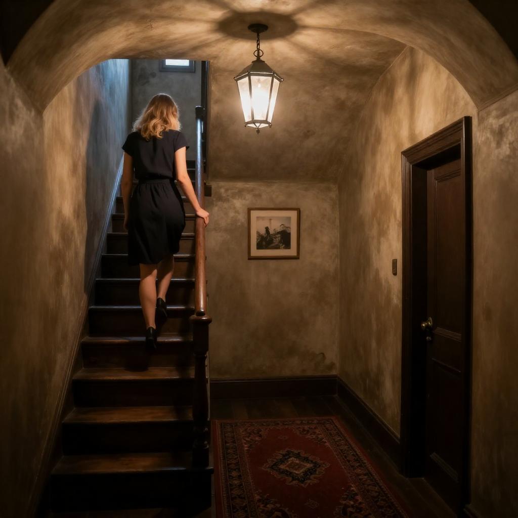 Photograph of a dimly lit, arched hallway with a woman ascending a dark wooden staircase on the left. She has blonde hair and wears a dark dress. The walls are aged and ured, with a red patterned rug on the floor. A single, bright lantern hangs from the ceiling, illuminating the scene. A framed picture hangs on the back wall, and a dark doorway is to the right.