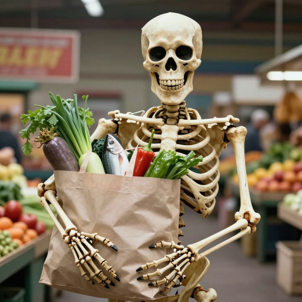Photograph of a skeleton holding a brown paper bag filled with vegetables and a bottle, standing in a brightly lit grocery store.