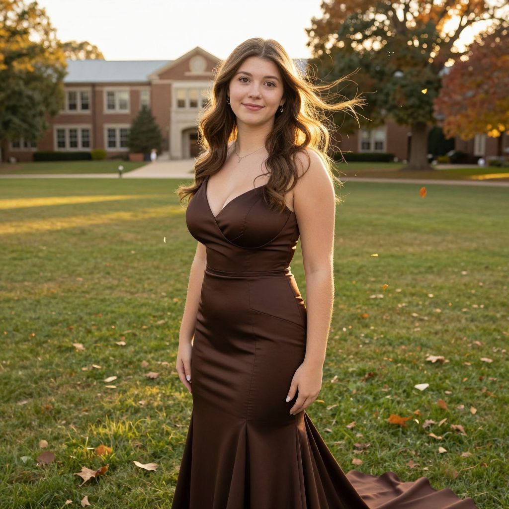 A realistic photo of a young woman with long brown hair and warm brown eyes wearing a elegant brown homecoming dress with a fitted silhouette and a flowing skirt, standing on a grand school lawn during homecoming season with fall leaves blowing in the wind and soft golden afternoon sunlight, her face expressive and smiling naturally. The woman has big tits and cute face