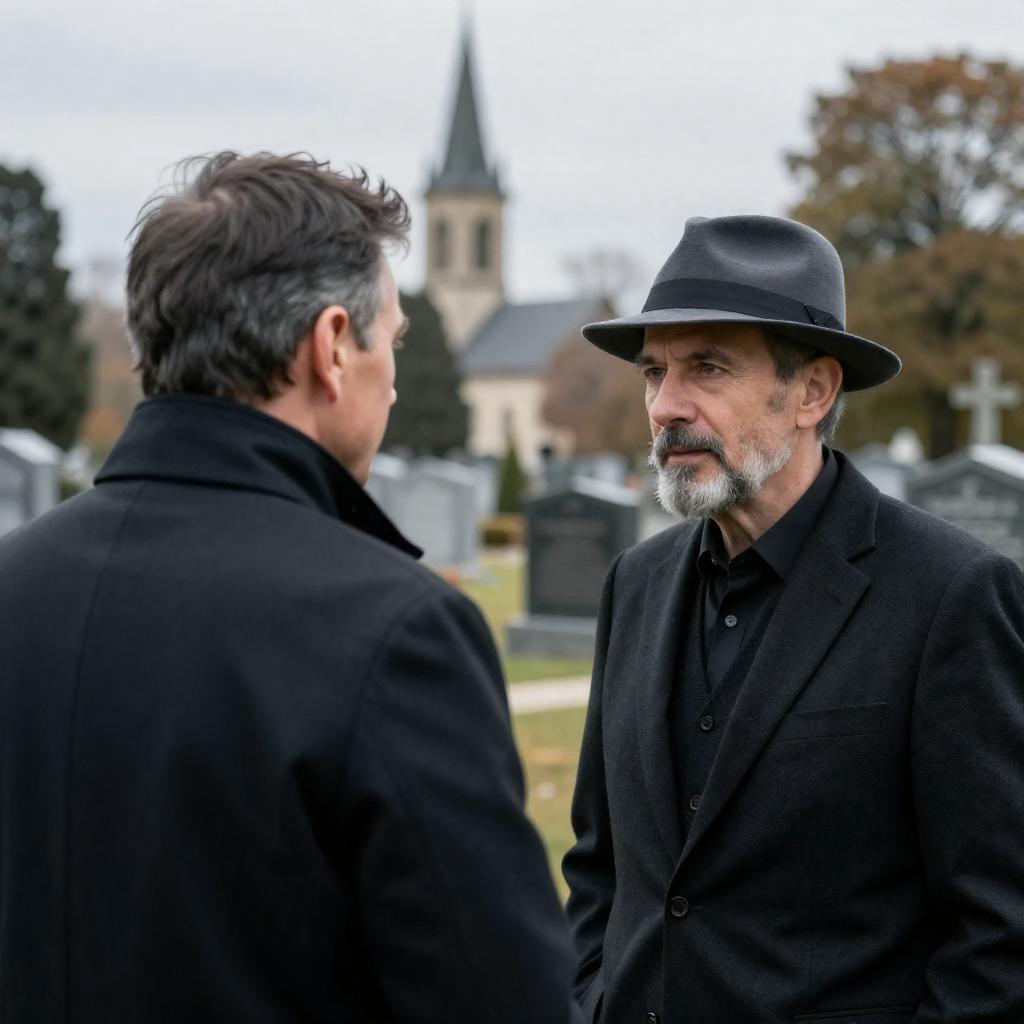 Two men standing in a cemetery, sunlight casting shadows. Elder man with white hair, beard, black suit, blue shirt, looking forward. Younger man with brown hair, beard, dark jacket, smiling, looking down. Iron fence in foreground, stone crosses in background.