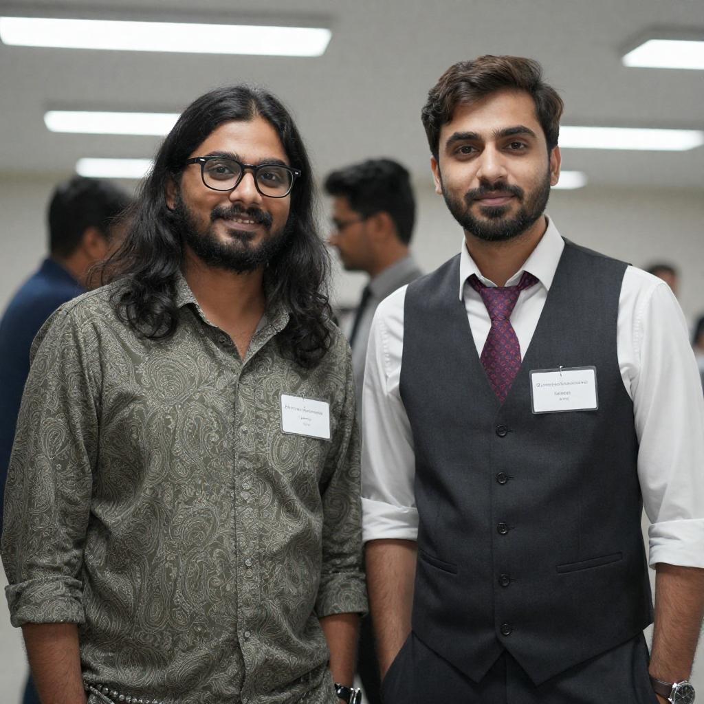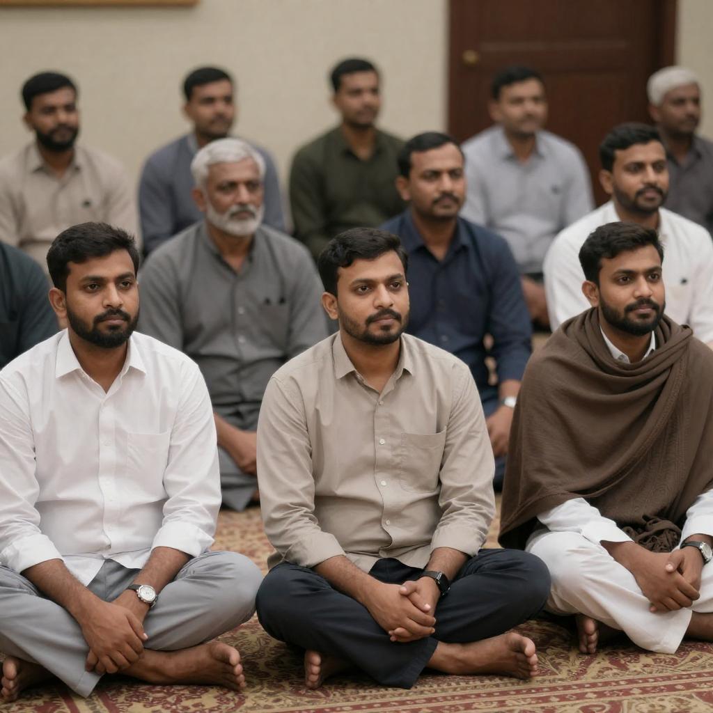 Group of men sitting on a carpeted floor in a dimly lit room. Foreground: three men, one in white shirt, one in beige shirt, one in brown shawl. Background: eight men, diverse ages, casual and formal attire. Neutral facial expressions. Carpet with red and beige patterns.