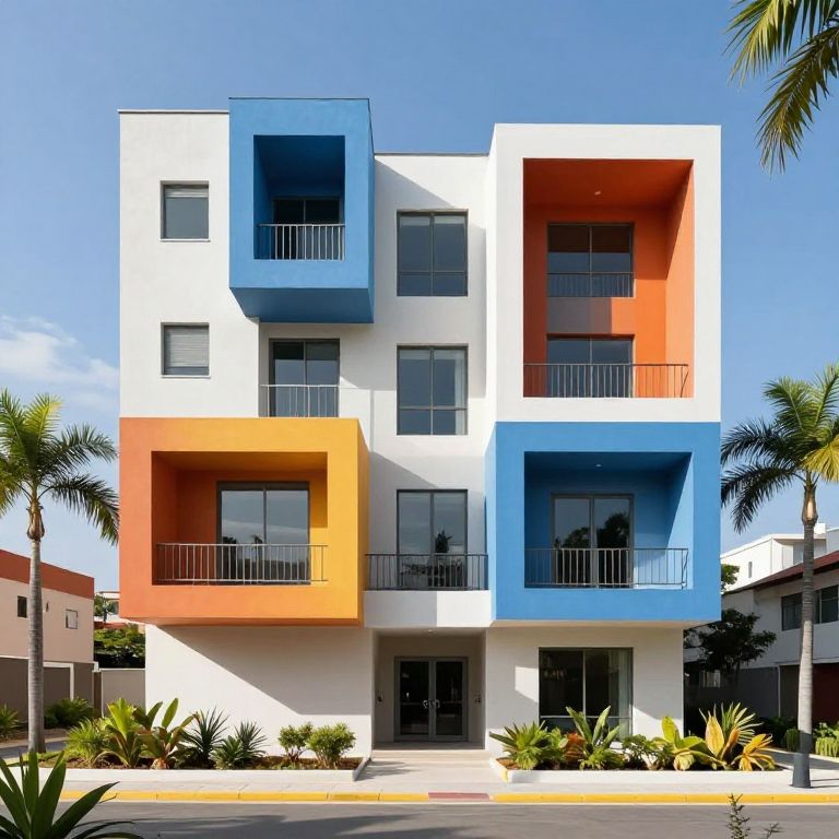 Modern building in arquitetonica architecture, featuring interlocking cubes and bright colors, tropical landscaping around, clean lines, symmetrical shapes, vivid contrast between shadows and light, photorealistic style with a vibrant atmosphere.