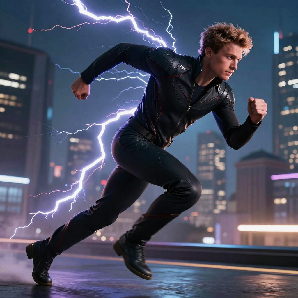 Photograph of a muscular, blonde-haired man with a determined expression, running in a dynamic pose. He is dressed in a tight, black, long-sleeve shirt and black pants, with black boots. Electric blue lightning bolts emanate from his back, illuminating his figure. The background features a nighttime cityscape with tall, illuminated buildings and neon lights. The ground is wet, reflecting the city lights. The man's physique is fit, and the lightning adds a dramatic, superhero-like effect to the scene.