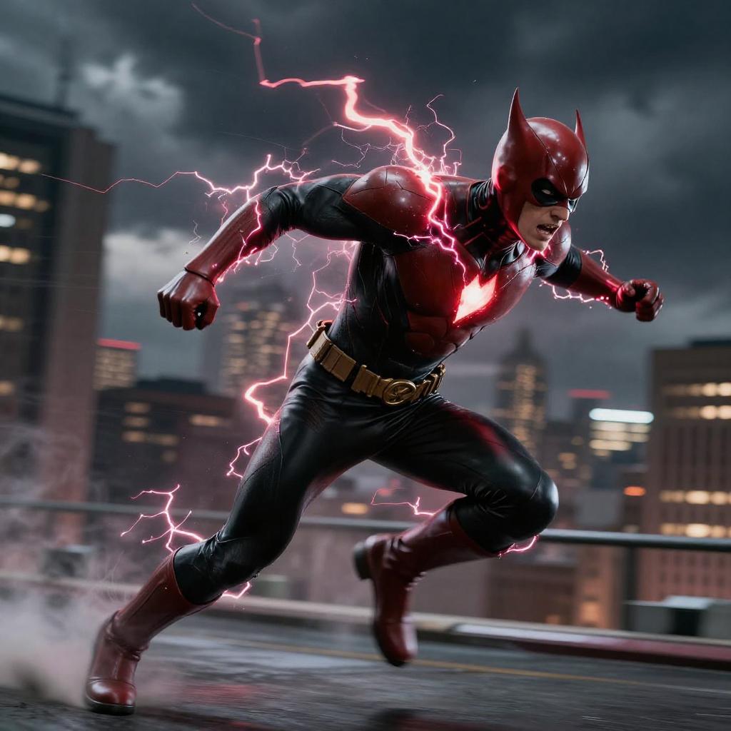 Lucas Till Flash in a dynamic sprint pose, vivid lightning effects surrounding him, futuristic cityscape background, intense expression, cinematic lighting, high detail